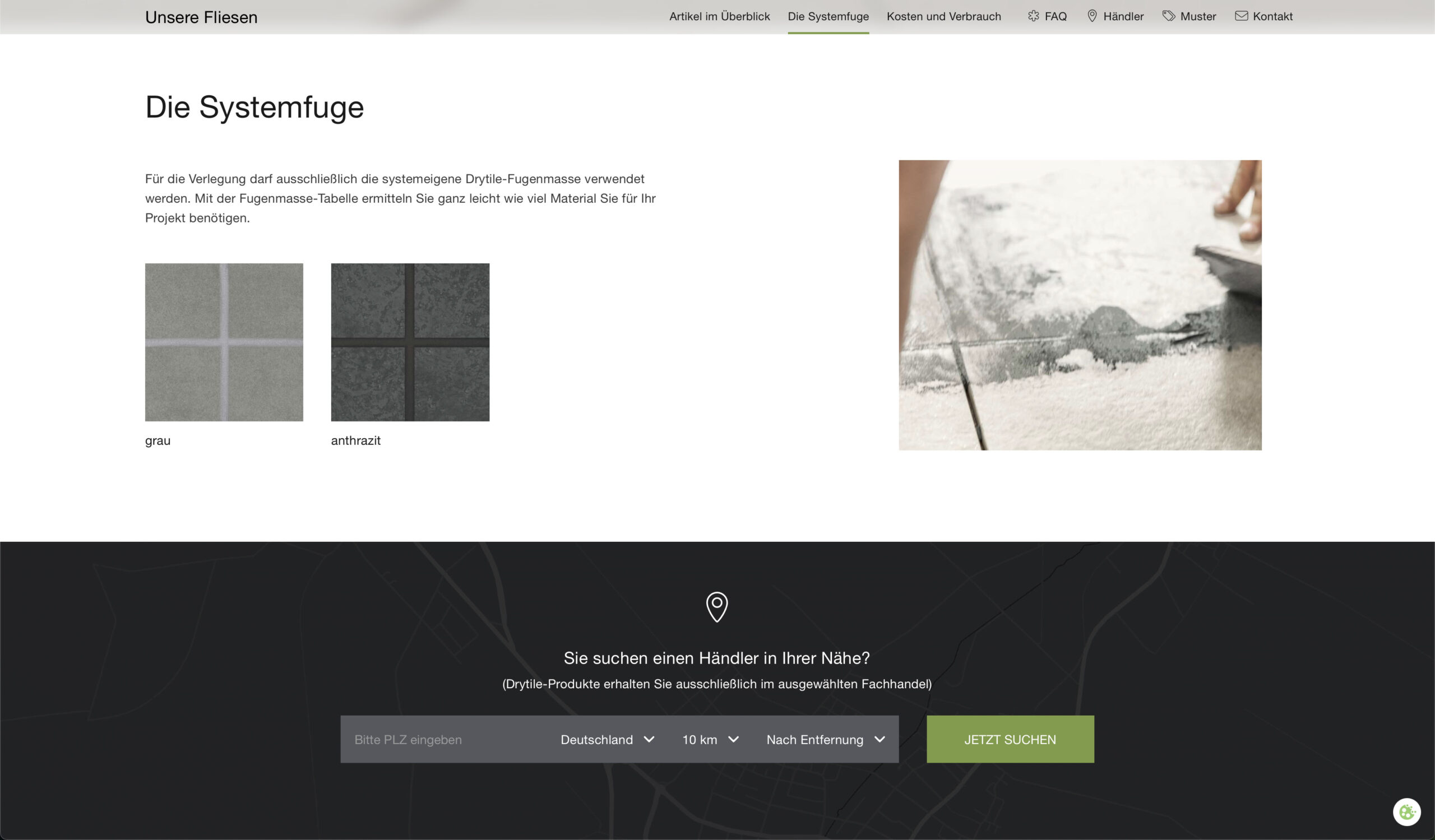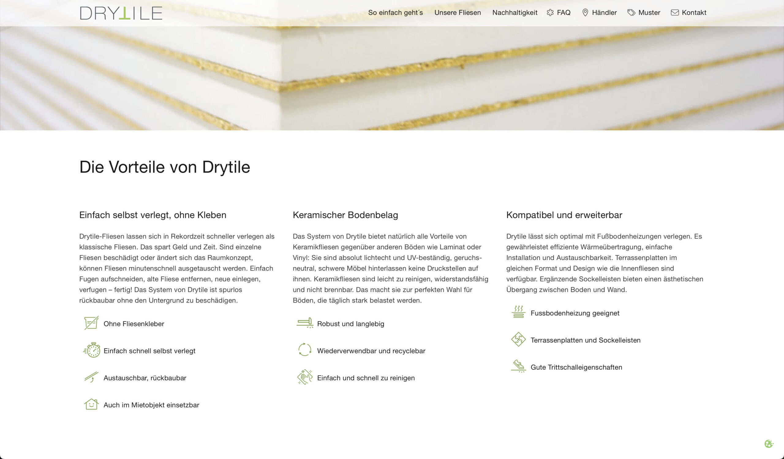 Wir haben die Website von Grund auf neu strukturiert, die Inhalte priorisiert und zentrale Benefits herausgearbeitet. Piktogramme und modulare Textbausteine machen die Vorteile auf den ersten Blick erfassbar – für Fachleute wie Endkunden. Die Bildsprache ist reduziert, aber hochwertig, und positioniert Drytile als funktionales wie designorientiertes Produkt. Technische Details wurden bewusst visuell abstrahiert, um nicht zu überfrachten.Eine zielgruppenspezifische Navigation ermöglicht es Nutzern, schnell die für sie relevanten Informationen zu finden. Ergebnis ist ein überzeugender, responsiver Auftritt, der Produkt und Marke stärkt.